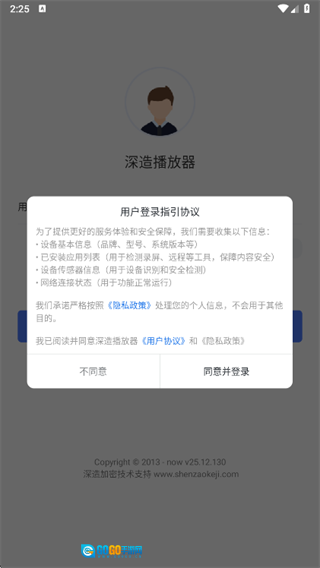 安装好深造播放器后,打开它就会弹出用户协议窗口,直接点击“同意”按钮就行。
