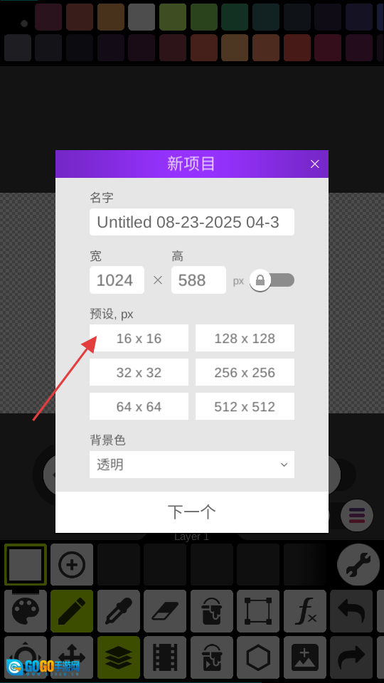 在新项目页面,你可以先选择尺寸,也可以先预设好参数,再点击“下一个”按钮。