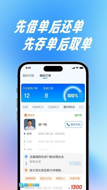 2、订单管理精细化程度高,可实现从订单类型、车型、积分到出发时间等多维度的筛选操作,订单信息清晰呈现,让出行规划更精准、更贴合需求。