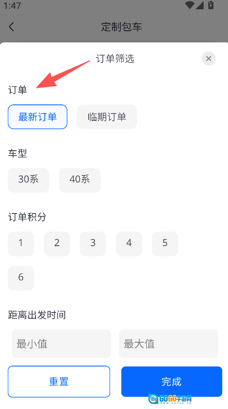 在定制包车板块,可对订单进行筛选操作,筛选完成后点击“完成”按钮即可。