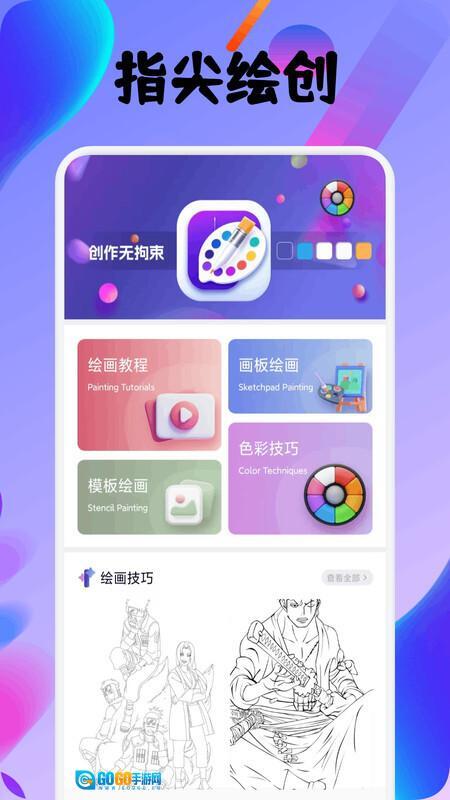 首页将为用户呈现绘画教程、画板绘画、模板绘画、色彩技巧等内容,方便大家学习和掌握绘画相关技能。
