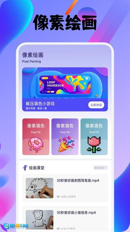 4、在像素页面里,你能找到解压填色小游戏与像素填色功能,还可以了解绘画课堂等相关内容。