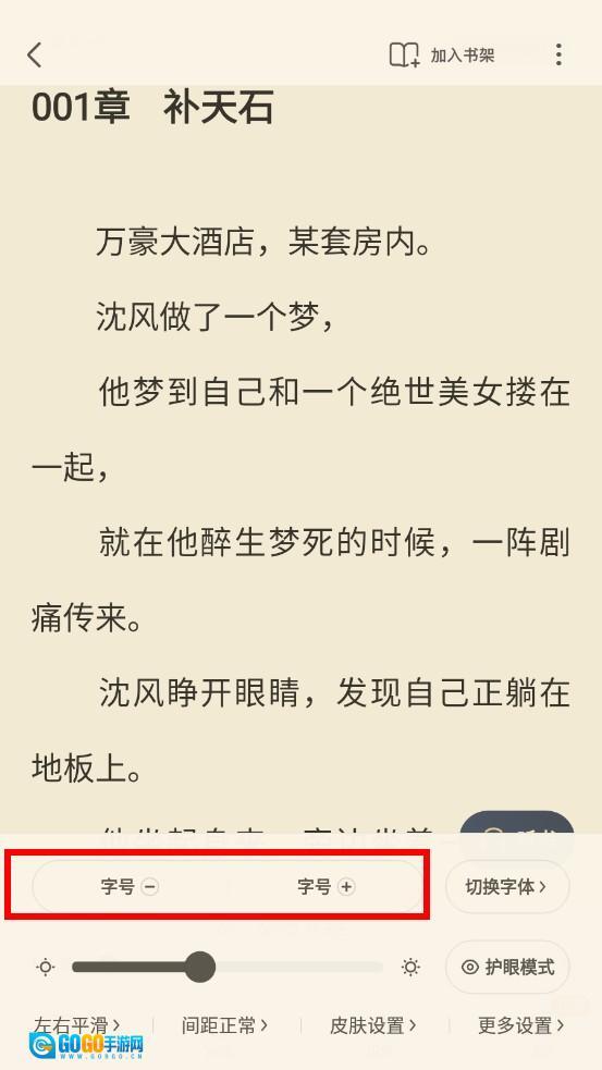 进入阅读页面后,找到外观类似字母“A”的“设置”图标并点击,即可展开包含字体、背景等参数的调整面板。