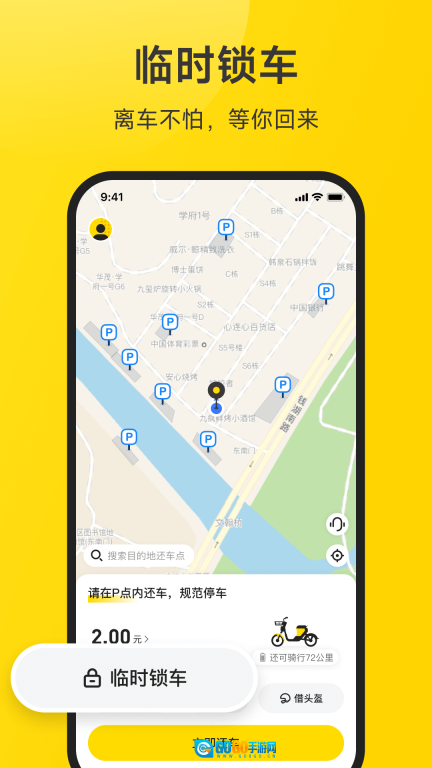 1. 找寻周边车辆,可随时租借与归还;借助手机扫描二维码,达成智能解锁。
