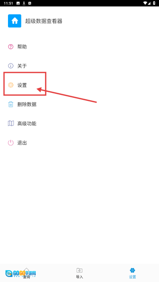 打开超级数据查看器应用程序,点击底部的设置选项,进入设置功能界面。