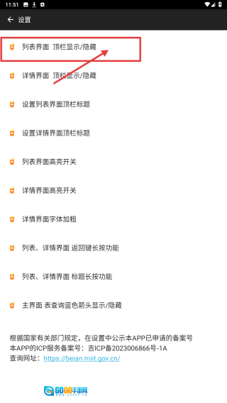 进入具体设置界面后,找到列表界面的顶栏显示/隐藏选项并点击,即可完成顶栏显示或隐藏的设置操作。
