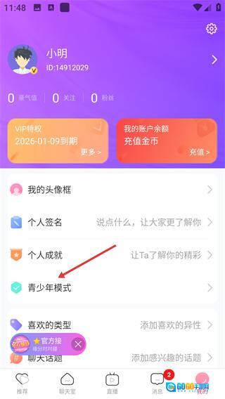 2、打开【我的】页面后,既可以对个人信息(如头像框、签名等)进行管理,也能找到【青少年模式】选项,该选项可用于限制互动类操作。
