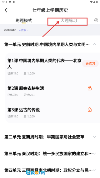 在历史学习页面,选择大题练习选项,进入大题练习模式即可开始练习。