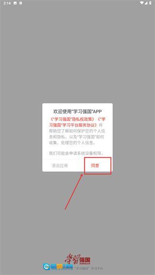 1、在“学习强国”启动弹窗,点击【同意-功能按钮】,确认隐私政策与服务协议,进入应用首页。