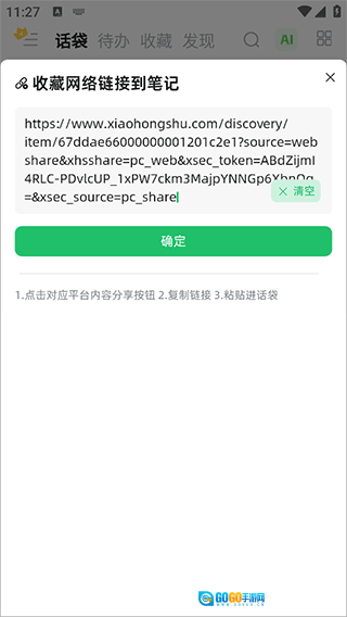 话袋配备了AI问答助手、AI脑暴等智能工具,用户提出问题后,系统会即时生成笔记形式的反馈,助力用户挖掘更多创作灵感。另外,它还支持添加多平台链接,只需一键操作,就能快速提取各网站的内容。
