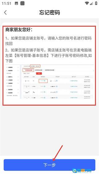 2、在账号密码登录页面,点击【忘记密码】选项后,会进入忘记密码说明页面,此页面针对店铺主账号和子账号分别说明了不同的密码找回方式。