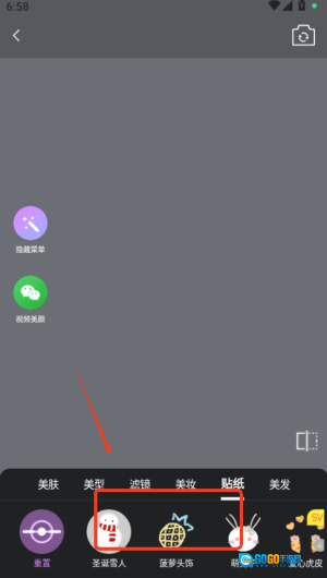 2、贴纸与滤镜管理模块,用户能够浏览并运用分类存储的各类特效,其中部分特效支持在屏幕上通过互动来触发。