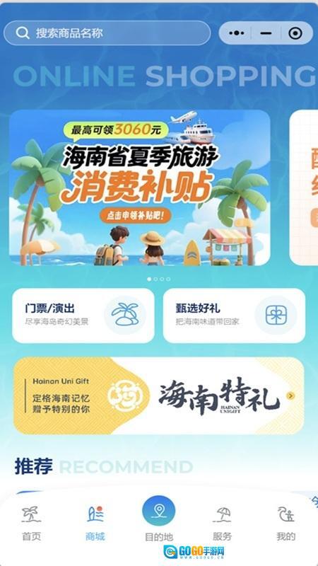 3、提供门票与演出购票、海南特色商品选购等服务,同时设有旅游消费补贴申领入口,便于游客进行旅游消费。