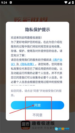 1、打开【启晖趣看极速版】后,先仔细阅读【用户协议】和【隐私政策】,随后点击【同意】按钮,即可进入软件主界面。