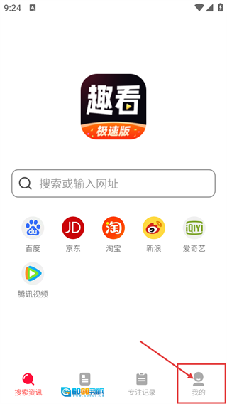 在软件主界面,你可以借助【搜索或输入网址】的功能来查找所需内容,之后点击底部的【我的】按钮,就能进入个人中心页面。