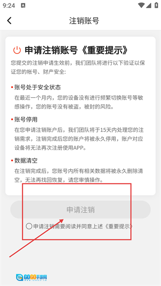 4、进入【注销账号】页面后,要先阅读【申请注销账号-《重要提示》】,勾选同意相关内容,之后才能点击【申请注销】按钮进行操作。