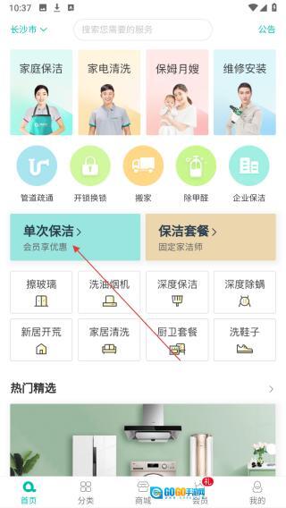 1、打开,在首页点【单次保洁】进入服务页。
