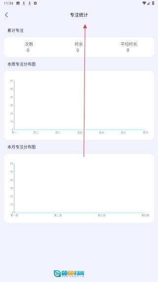 3、进入【专注统计】页面,查看累计专注次数、专注总时长、专注平均时长,以及本周和本月的专注分布情况。