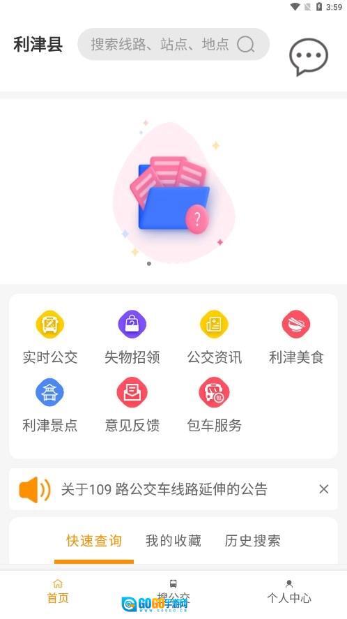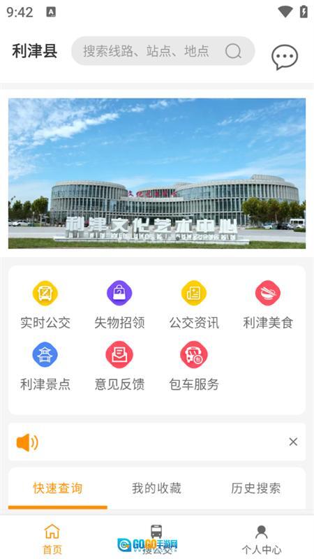 1、在软件的首页,我们可以看到实时公交、失物招领、公交资讯、利津美食、利津景点、意见反馈、包车服务等多个板块。