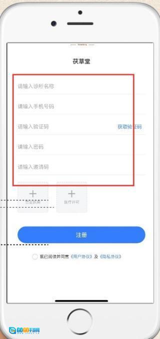 2、注册账号页面,依次填诊所名称、手机号、验证码、密码、邀请码,勾选协议后点【注册】。