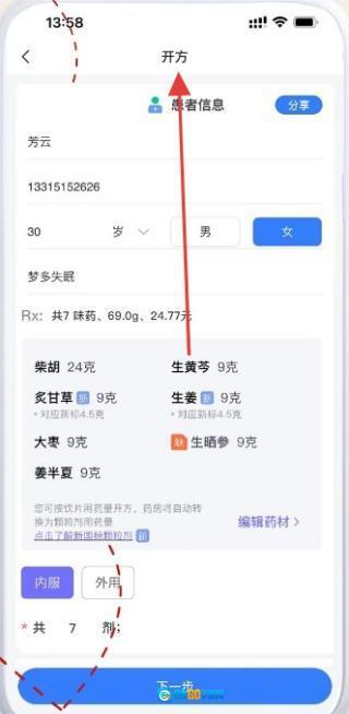 3、在【开方】界面,确认患者信息、药材及剂数等。