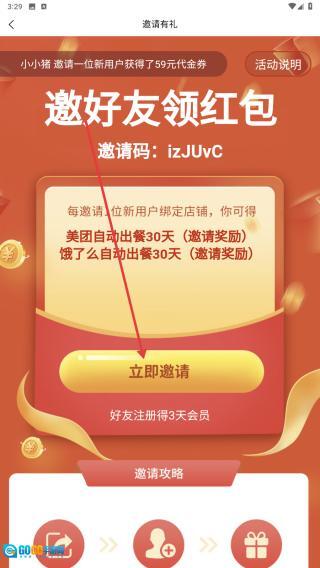 4、进入邀请有礼页面,点击【立即邀请】按钮,分享专属邀请码,邀请好友完成绑定即可获得奖励。