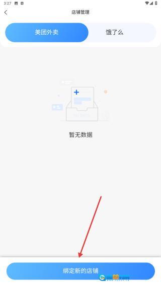 2、进入店铺管理页面后,点击【绑定新店铺】选项,然后选择美团或饿了么平台进行绑定操作。
