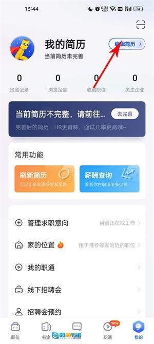 3、在个人头像旁边有一个编辑简历,点击进入进行编辑;