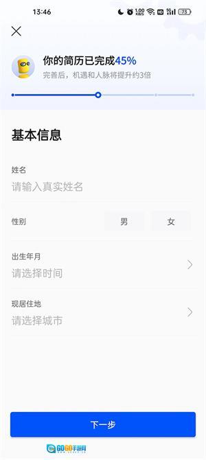 5、点击下一步之后回来到基本信息填写页面,将个人的姓名、性别、出生年月、选居住地填写之后,在点击下一步,依次填写自己的个人信息之后点击确定就完善好了自己简历。