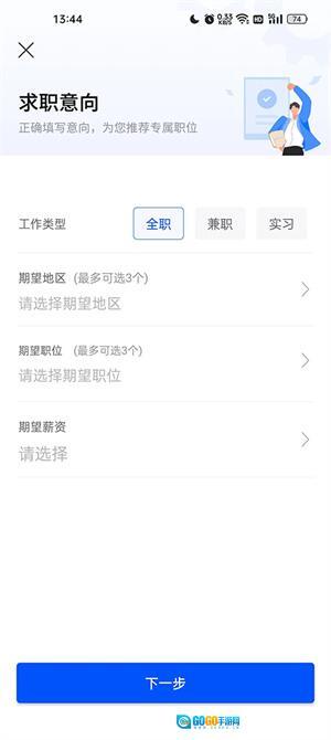 4、将求职意向中的工作类型、期望地区、期望职位、期望薪资完善之后点击下一步;