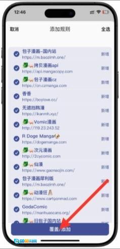 5.在解析出来的漫画源中进行勾选,点击下方【覆盖/添加】;
