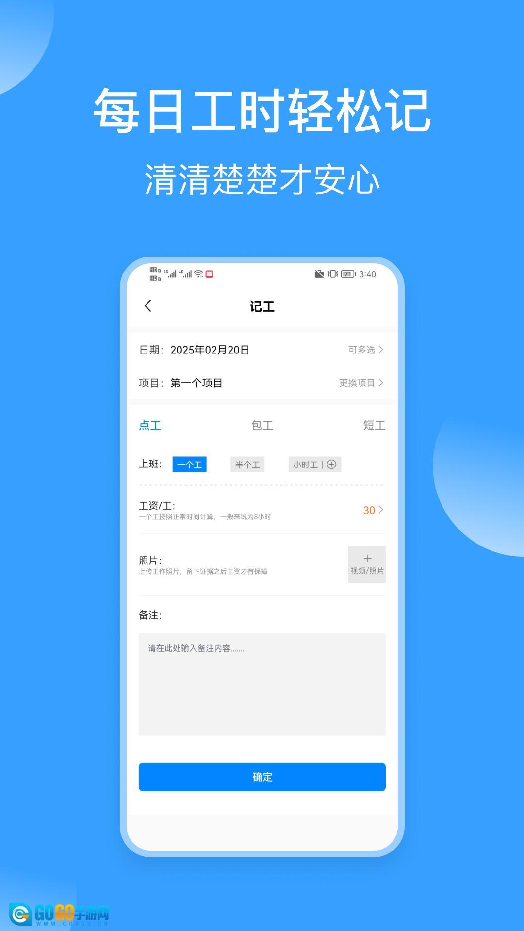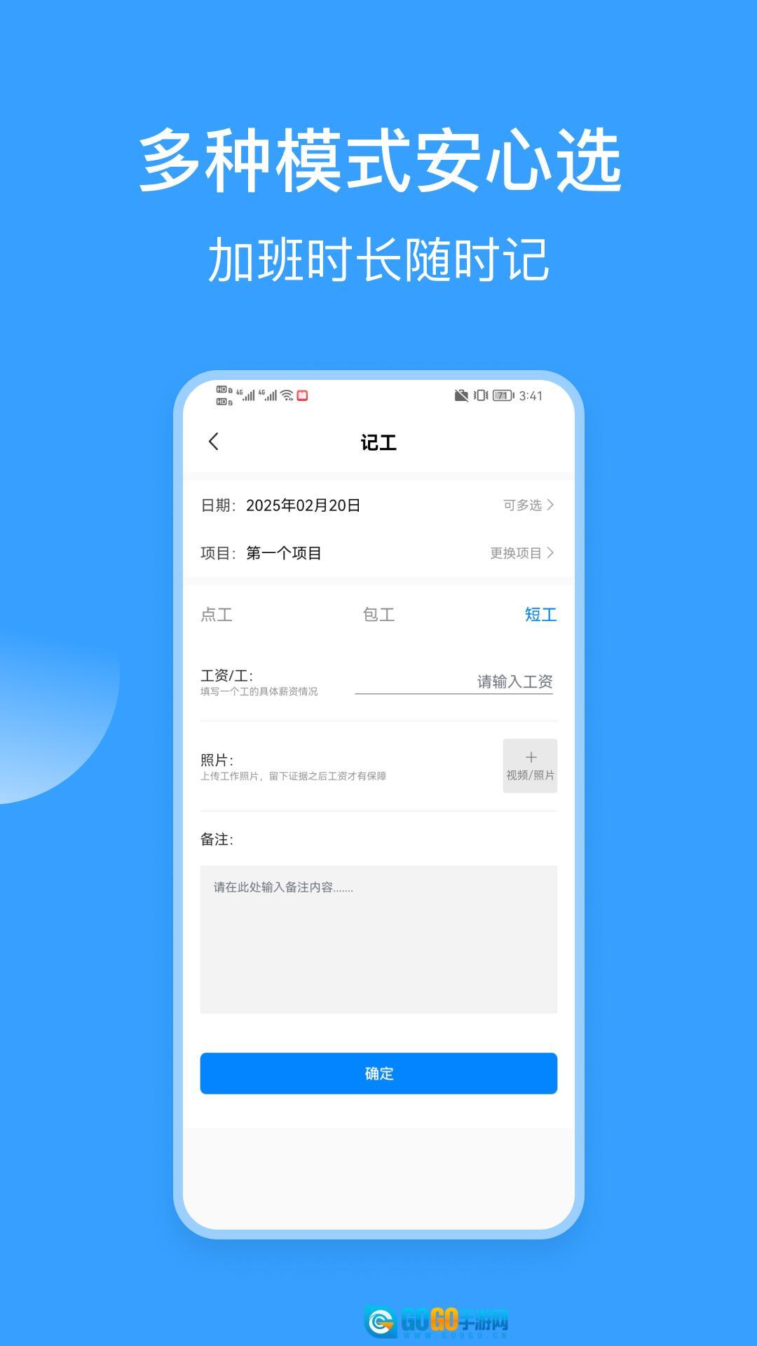 《记工表》给你提供自由简单的记录操作服务,轻松来体验到非常不错的省心玩法,记工表为你带来更加省心的玩法,可以更好的感受到不一样的记录操作,给你带来简单自由的玩法体验,给你省心的服务操作。整合了招聘求职功能,工人可根据工种智能匹配附近高薪岗位,企业也能快速发布招工信息,实现“招工快、找活快”的双向匹配。适用人群覆盖广泛,从建筑行业的瓦工、水电工、钢筋工,到工厂操作工、物流配送员,再到餐饮服务行业的钟点工,只要有记工需求的群体都能找到适配功能。对于班组长和劳务管理者,多人工本管理、考勤数据实时查看、报表自动生成等功能,能大幅降低管理成本;对于普通工人,简洁的操作界面、大字模式设计,即便不熟悉智能设备也能快速上手,真正实现“人人会用、人人好用”。