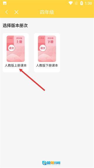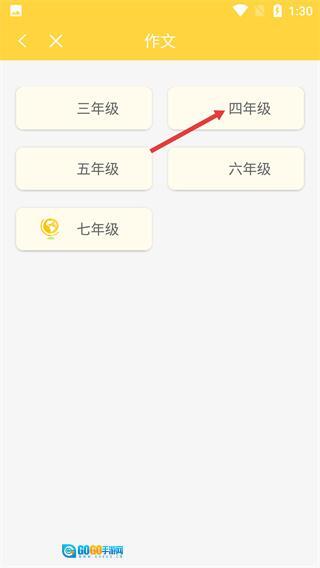 1、进入作文的年级选择页面,点击【四年级】选项,选定对应年级,进入版本册次的选择界面。