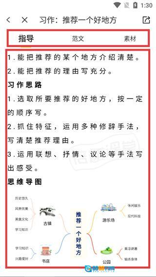 4、在该习作的指导页面,可查看习作要求、写作思路及思维导图,借助这些内容辅助完成“推荐一个好地方”的作文创作。