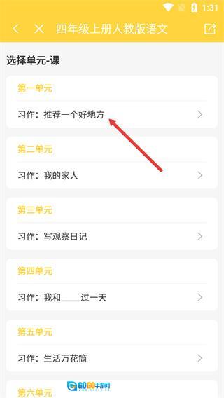 3、在单元-课选择页面,找到第一单元的【习作:推荐一个好地方】选项,点击进入该习作的专属指导页面。