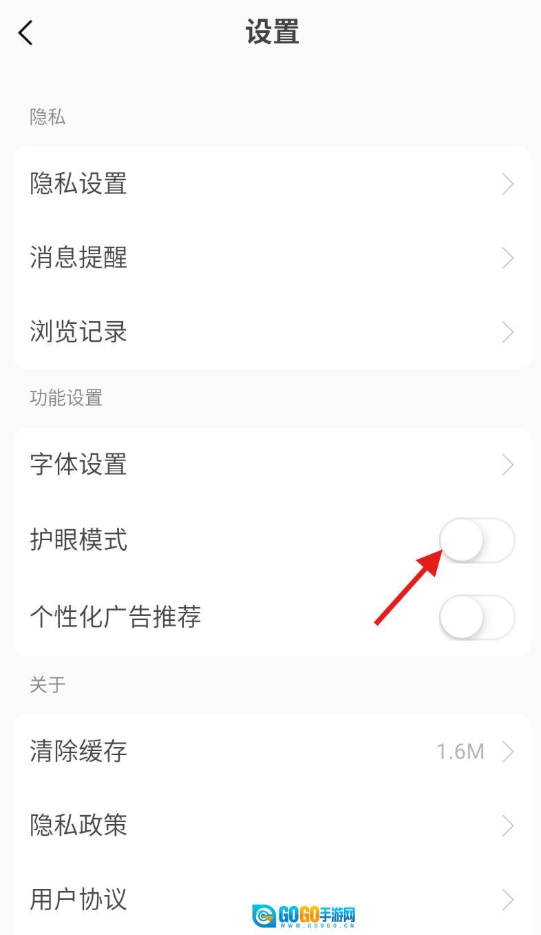 4、进入设置界面后,找到护眼模式的选项,点击它旁边的开关按钮,就能开启护眼模式了。