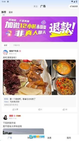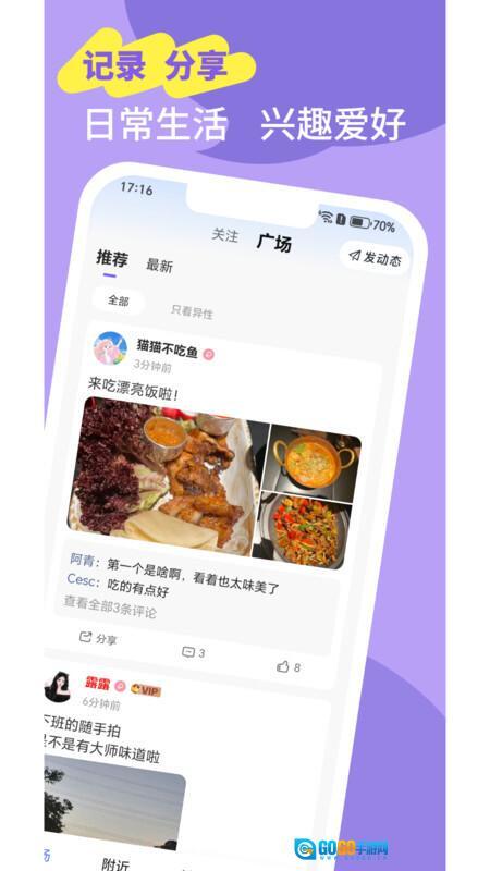 1、完成安装并进入应用后,在广场页面能够看到系统推荐的好友所分享的生活动态。