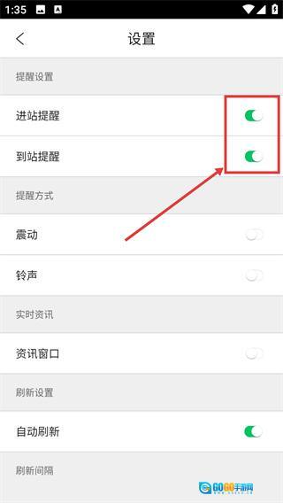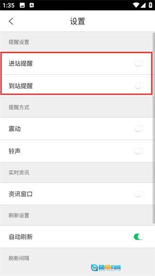 4、进入【提醒设置】页面后,找到【进站提醒】和【到站提醒】对应的开关按钮,点击即可启用这两项提醒功能。