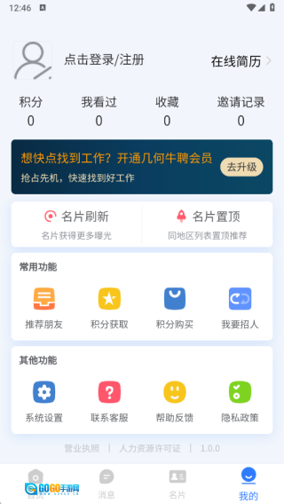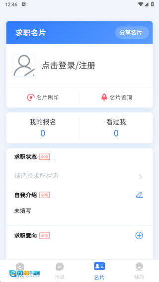 3、在名片页面能够查看我的报名情况,填写求职状态、自我介绍以及求职意向等相关信息;