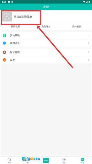 1、在“发现”页面,点击【请点击登录/注册】的区域,即可进入账号登录或注册的操作界面。