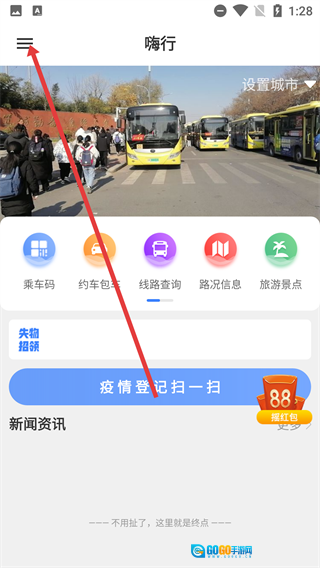 1、在“嗨行”首页点击左上角的菜单按钮,展开功能侧边栏后,就能看到切换城市、资料编辑等功能选项。