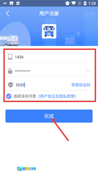 在用户注册页面,依次填写手机号、密码与验证码,勾选《用户协议及隐私政策》后,点击【完成】按钮,即可完成“嗨行”账号的注册流程。