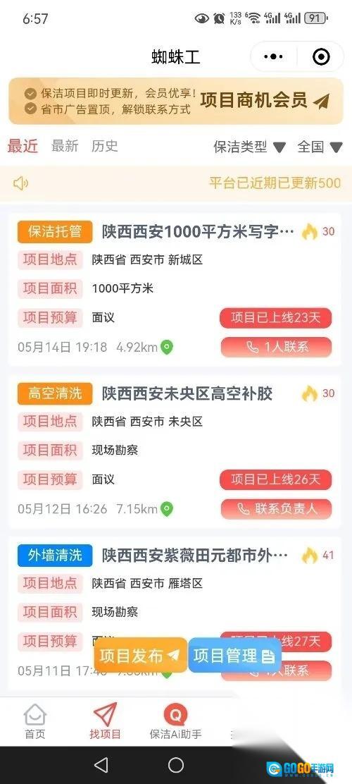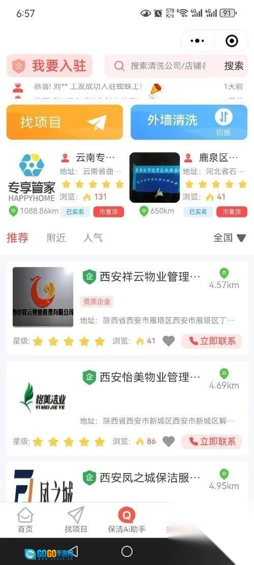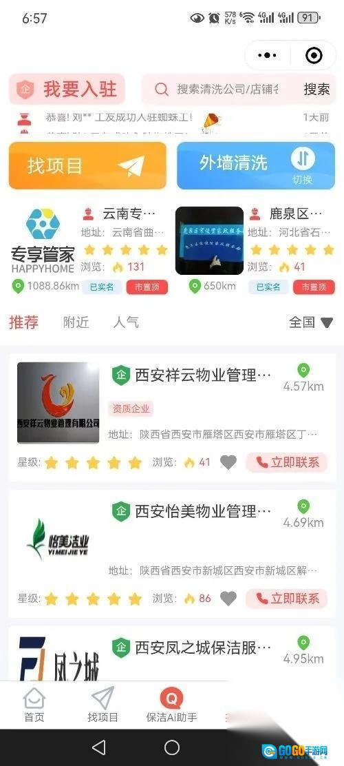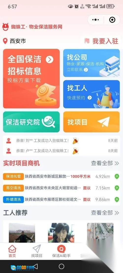 1、在首页能够快速查找公司、工作以及项目,同时还能获取全国保洁的招聘信息等内容;