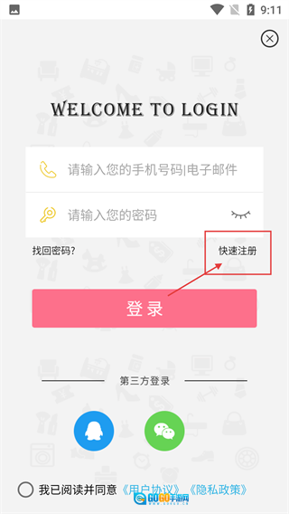3、在登录界面,要是还没有注册账号,你可以点击【快速注册】按钮,这样就能跳转到注册页面去完成新账号的创建了。