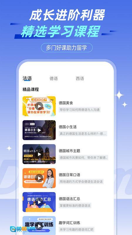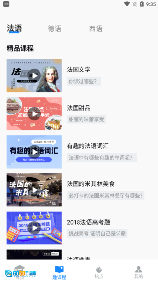 3、在趣课程页面中,能够了解法语、德语、西语等不同语言版块的相关内容。