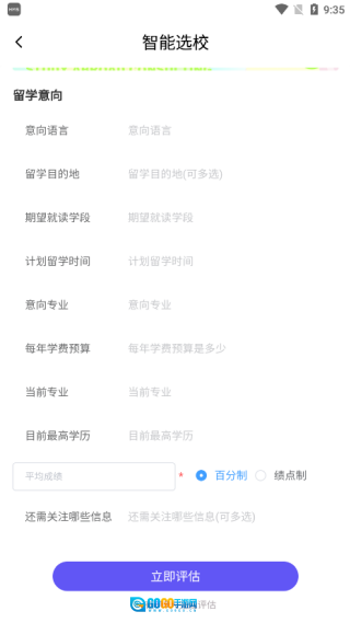 2、进入智能选校页面后,填写你的留学意向相关信息,接着点击立即评估按钮完成操作。