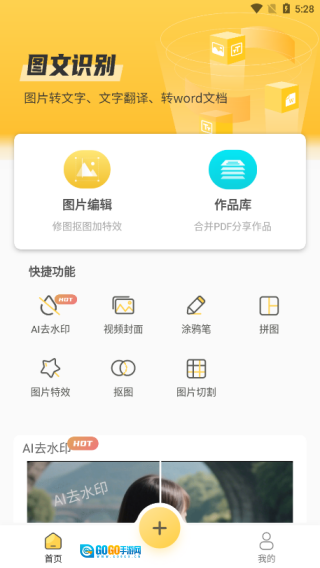 首页配备了图片编辑、作品库功能,此外还整合了各类快捷操作选项。