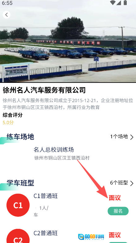 2、进入驾校详情页面,查看练车场地、学车班型以及报名相关信息。
