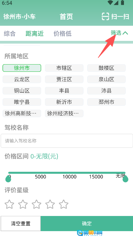 1、点击筛选功能,可选择所属地区、价格区间以及评价星级等条件,从而精准查找合适的驾校。