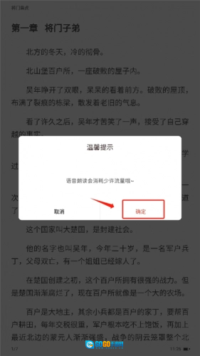 4、首次使用时会产生语音朗读的流量消耗,点击“确定”即可。